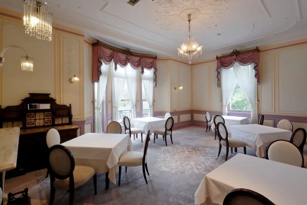長楽館は、隣接する新館に客室を備えたホテルとして利用できる他、洋館内には、フレンチレストラン「LE CHENE(ル シェーヌ)」も併設されています。