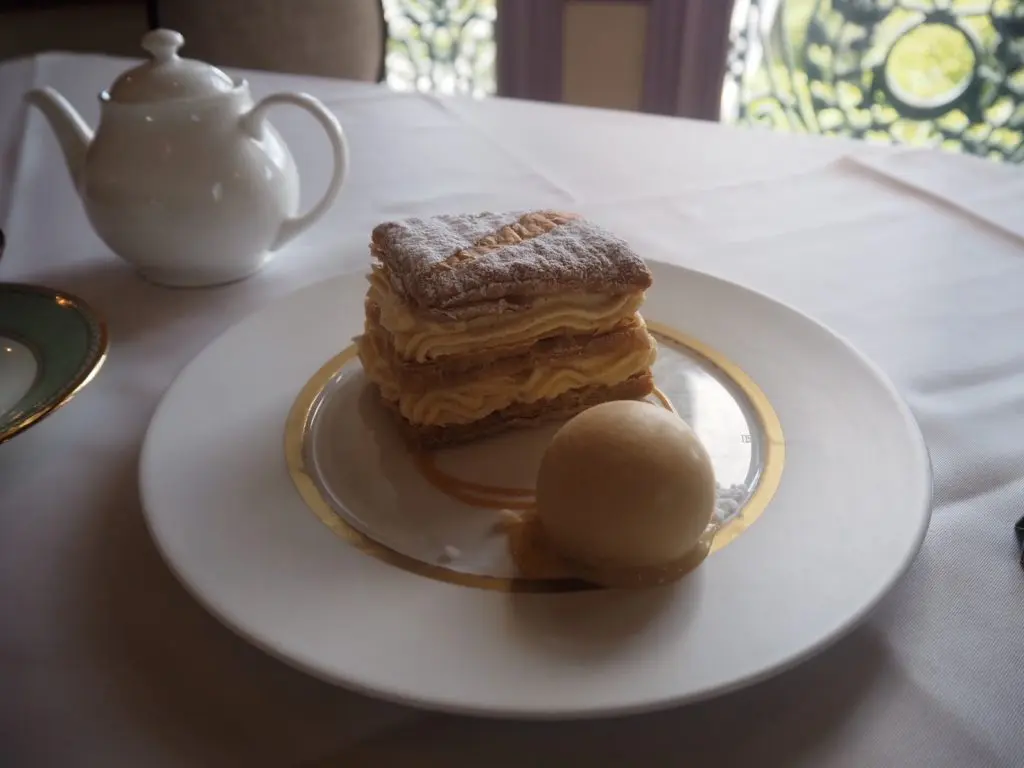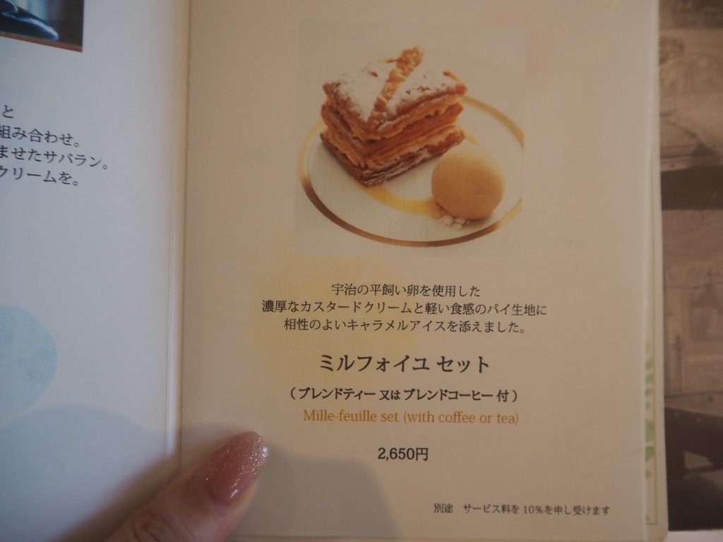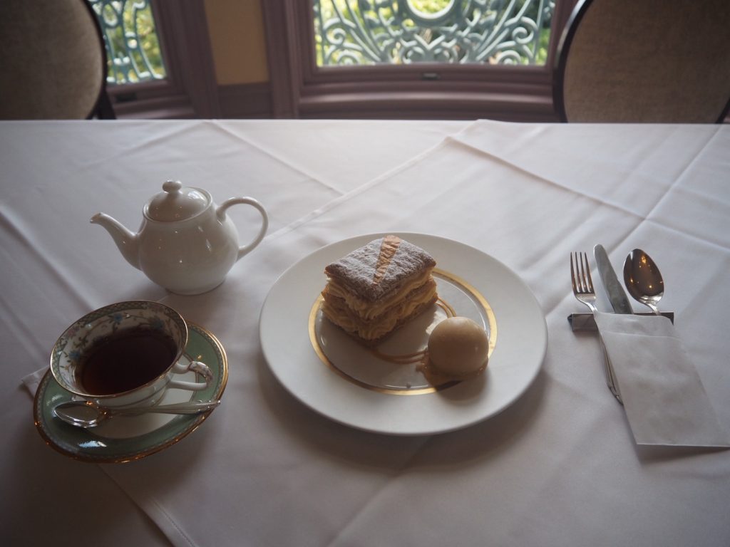 今回は貴婦人の間にて、看板メニュー「ミルフォイユ」をいただくことに。セットのドリンクは、ブレンドティーまたは深入りのブレンドコーヒーから選べます。