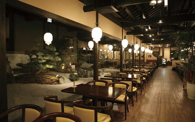 店内に足を踏み入れると、ゆとりをもって配置された座席の先に大きなガラス窓が広がり、丁寧に剪定された松や中庭の景色を一望できます。