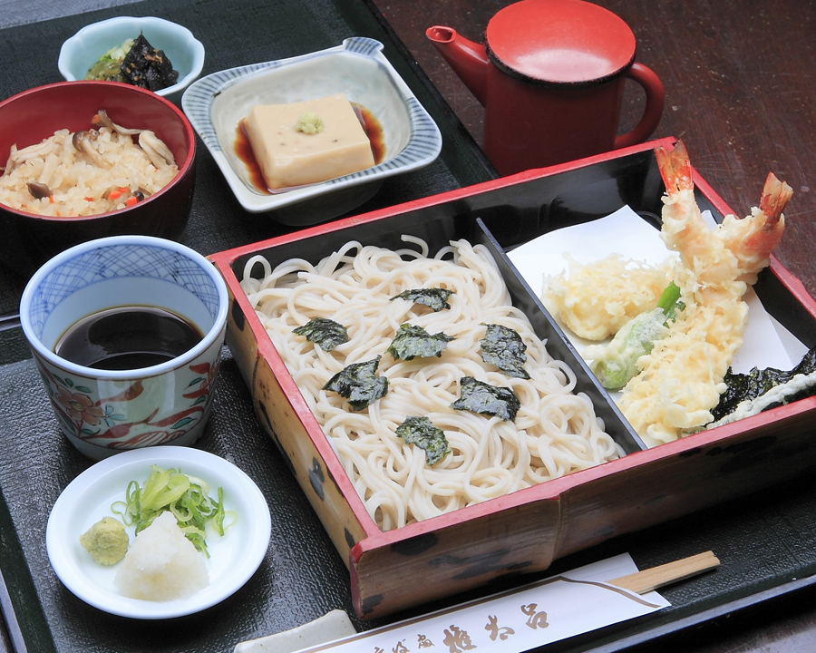 「天ざる御膳(税込2,400円)」は、天ぷらの盛り合わせと、ざるそばまたはざるうどんがメインのメニュー。自家製そば実豆腐・季節ごはん・香の物がセットになっています。