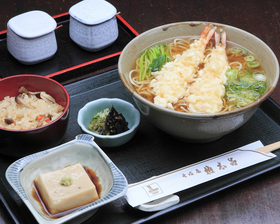 「天ぷら御膳(税込2,400円)」は、天ぷらそばまたは天ぷらうどんをメインにしたメニュー。自家製そば実豆腐・季節ごはん・香の物がセットになっています。