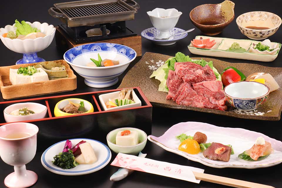 「光緑園 西清」での滞在を特別なものにしてくれるのが、山里の食材を活かした会席料理です。四季折々の食材にこだわり、一品ずつ丁寧に仕上げられた料理は、素材本来の味わいをしっかり感じられるものばかりです。
