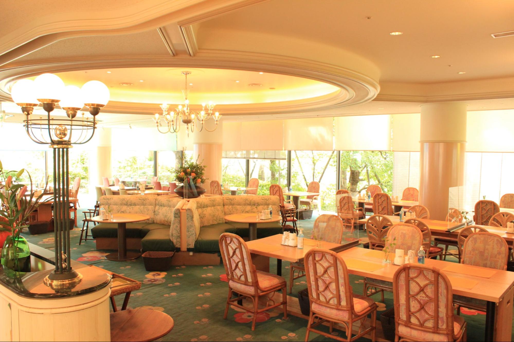 「シャンゼリゼ」は、宝塚ワシントンホテルにあるカジュアルレストランです。旬の食材を使った季節感溢れるフード&スイーツメニューをお楽しみいただけます。店内に設置されている大きな窓からは、緑豊かな宝塚の山々を見渡すことができ、開放感のある空間です。