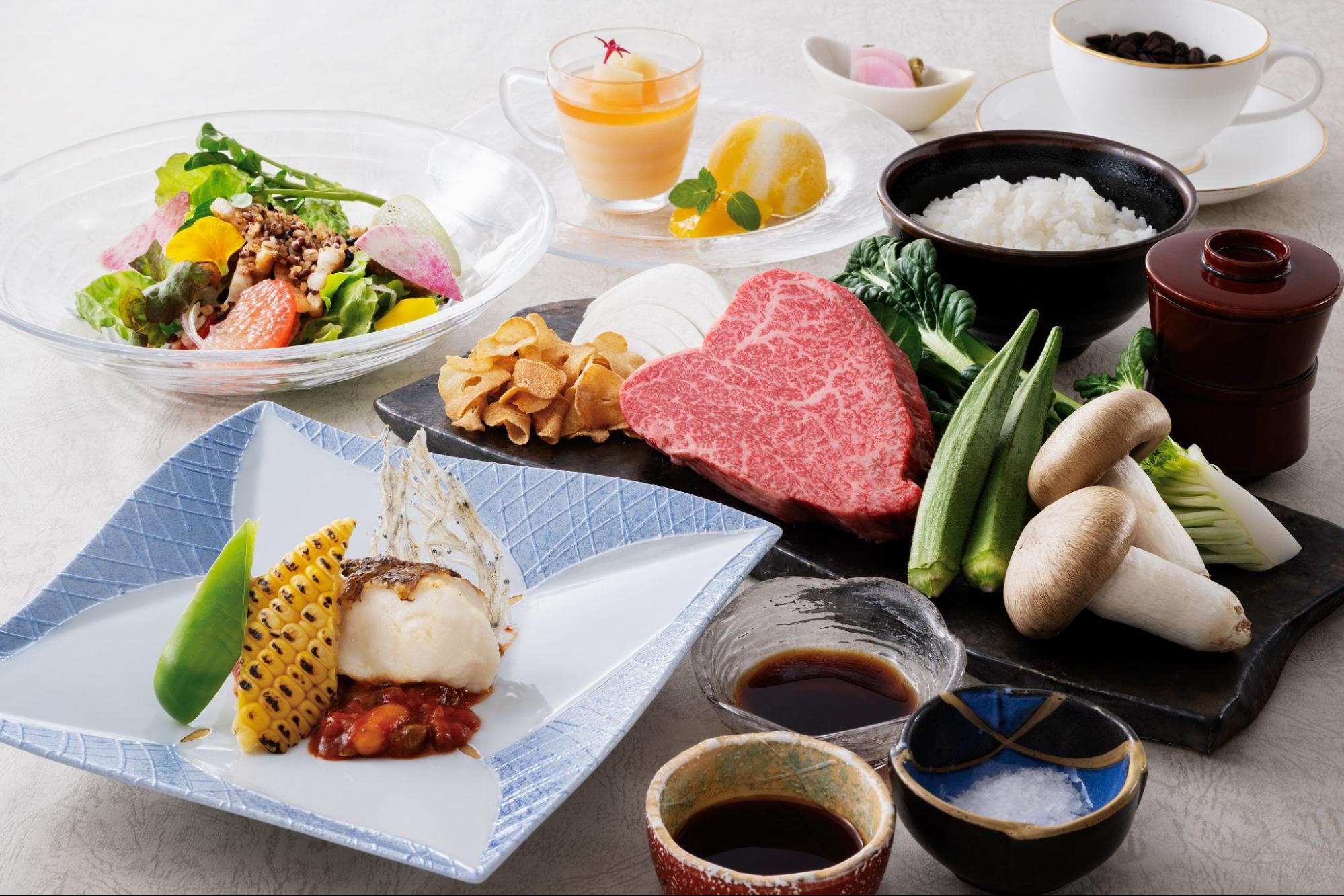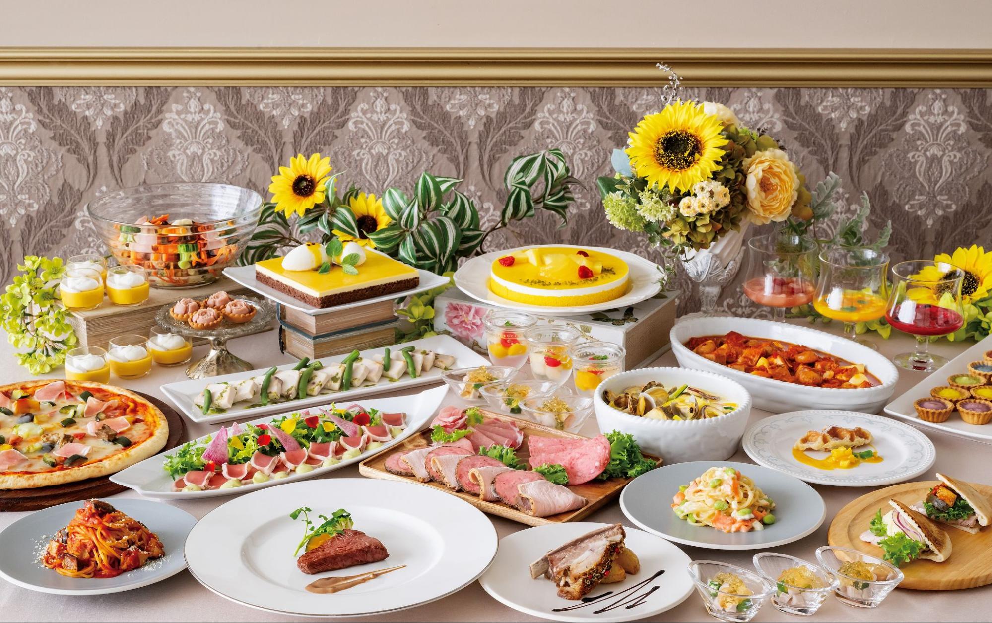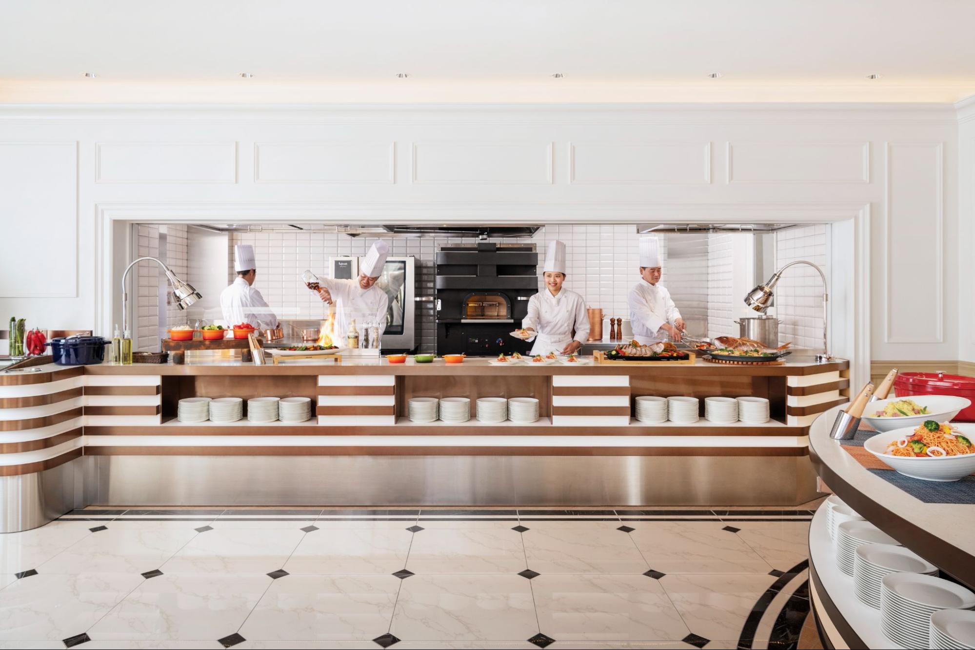 シェフがひと皿ずつ仕上げるオープンキッチンでもてなすメイン料理をはじめ、色鮮やかな野菜とトッピング、豊富な種類のドレッシングで自分好みにカスタマイズできるサラダ、パティシエがその場で仕上げる月替わりモンブランや季節の訪れを感じるスイーツなどをお楽しみいただけます。