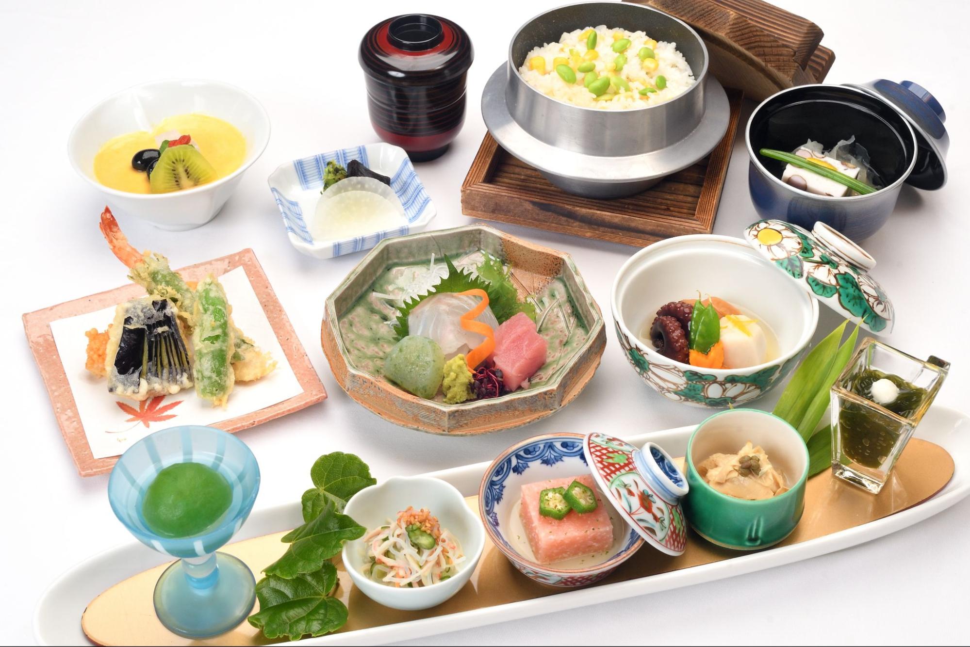 5,500円 | ・前菜 ・吸物 ・造り ・煮物 ・油物 ・蒸し物 ・釜飯 ・止椀 ・香の物 ・水菓子 |