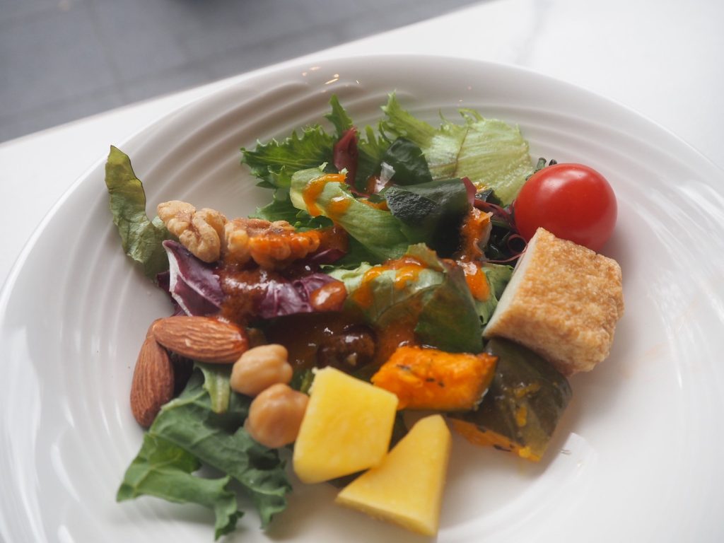 ハーフブッフェスタイルで自由にいただけるサラダは、野菜だけではなくナッツ類も充実。お店の方におすすめいただいたトマトドレッシングは、甘味と酸味のバランスがよく、まろやかな味わいに驚きました。