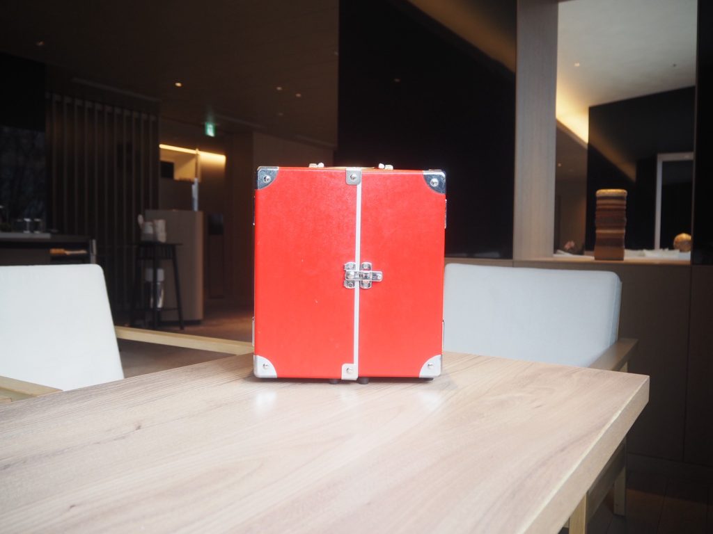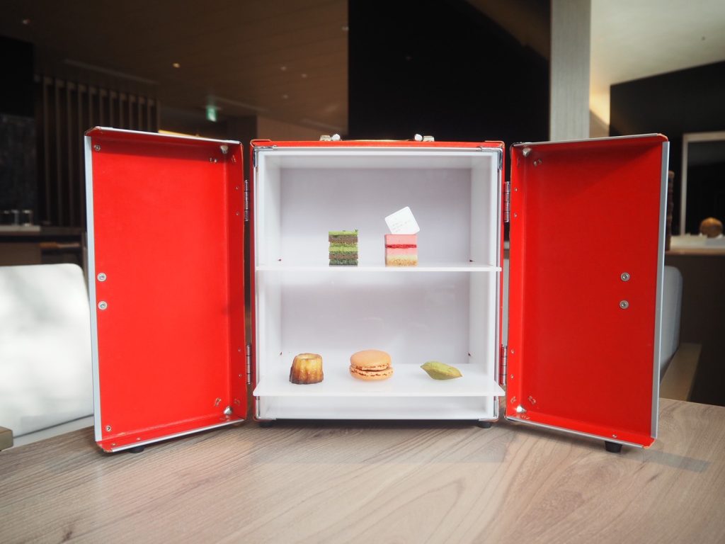 スイーツはトランクケースに収められた状態で提供され、扉を開けるとミニサイズのスイーツが5種類、きれいに並んでいます(写真は1名分)。思わず「可愛い!」と声がこぼれました。