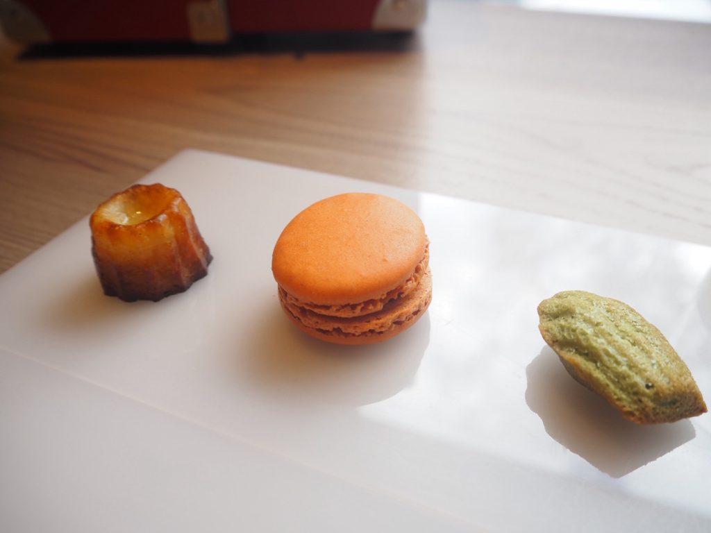 下段中央のマカロンは、4種類の中から日替わりで味が変わるとのこと。この日は、塩キャラメル味をいただきました。外はサクサク、中からキャラメルソースがとろりと溶け出す、大人のマカロンです。