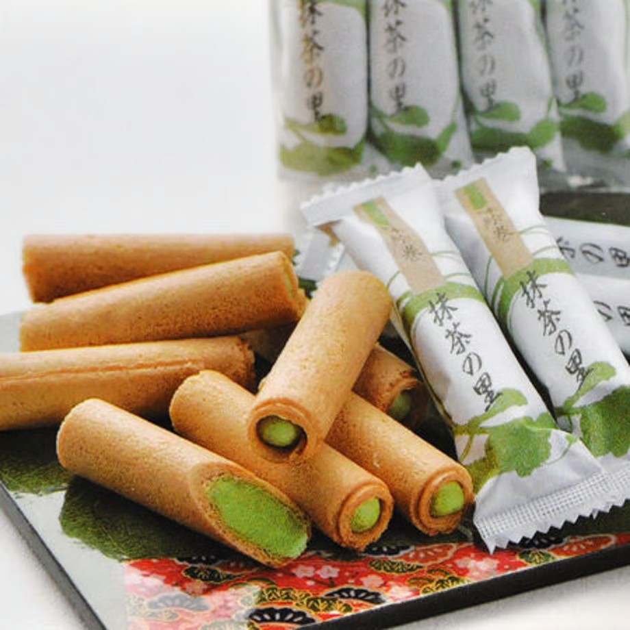 卵せんべいと抹茶が相性ピッタリな「抹茶の里」(13本入り/税込450円)。抹茶は甘さを加えたクリーム状になっており、苦いものが苦手な方でも美味しく食べられます。